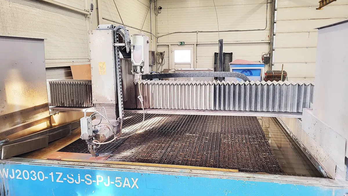 Provádíme řezání materiálu na stroji PTV WJ2030 s využitím 3D otočné hlavy jednak pro maximální eliminaci podřezů, hlavně u silnějších materiálů, ale i pro využití možnosti řezání pod úhlem, kdy je možno naklápět hlavu o ± 45°.